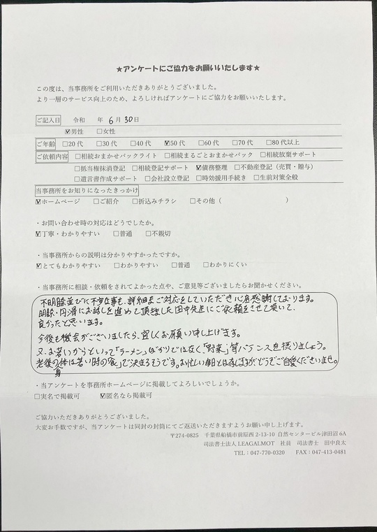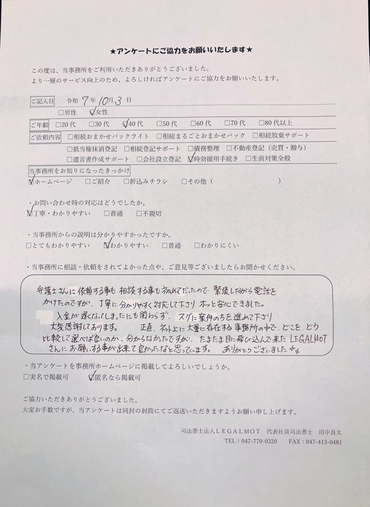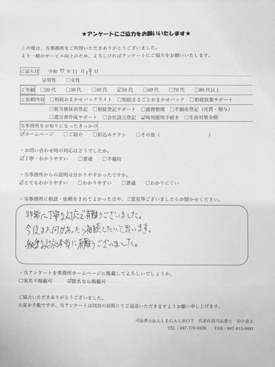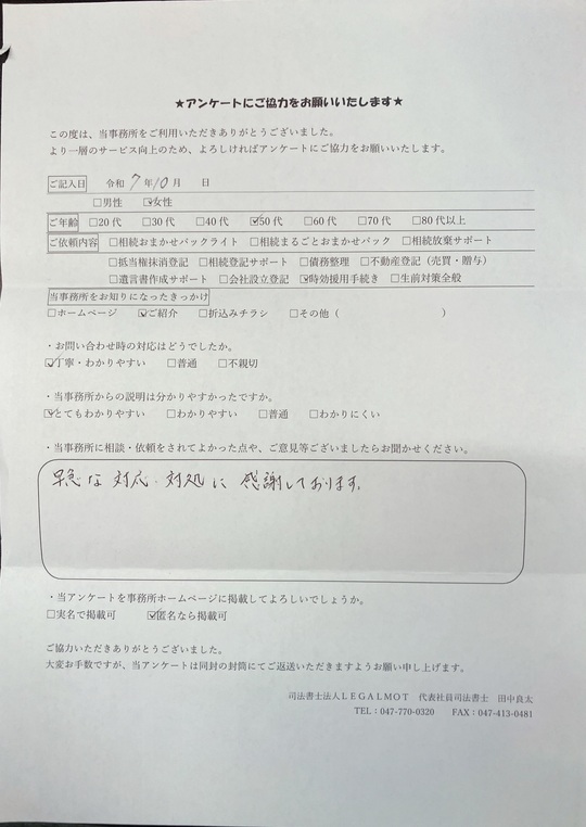 この度は当事務所にご依頼いただき、またアンケートにご協力いただきまして誠にありがとうございます。